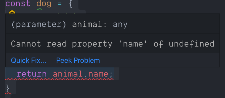 animal객체가 undefined 이기 때문에, undefined에서 name값을 조회 할수 없어서 이렇게 에러가 발생하게 된다.