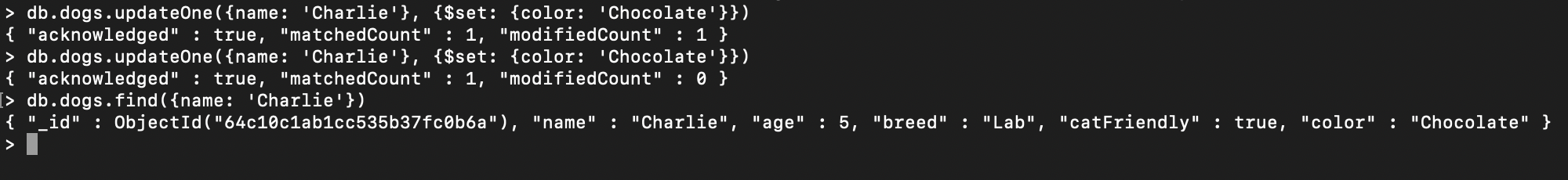 db.dogs.updateOne({name: 'Charlie'}, {$set: {color: 'Chocolate'}})