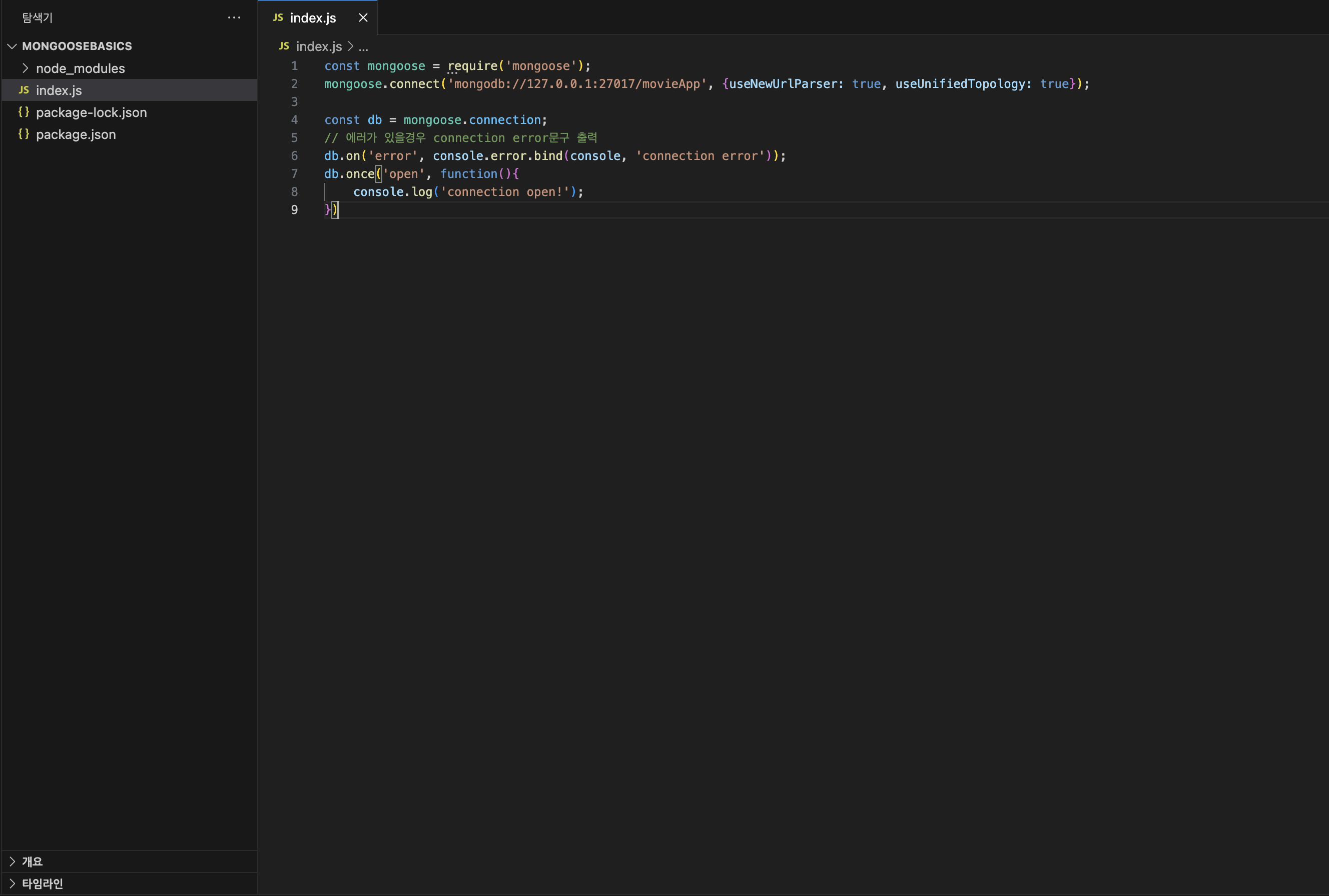 위의 코드를 입력하고 cmd창에서 다음과 같이 입력하면 movieApp DB에 연결된것을 확인 할수 있다.