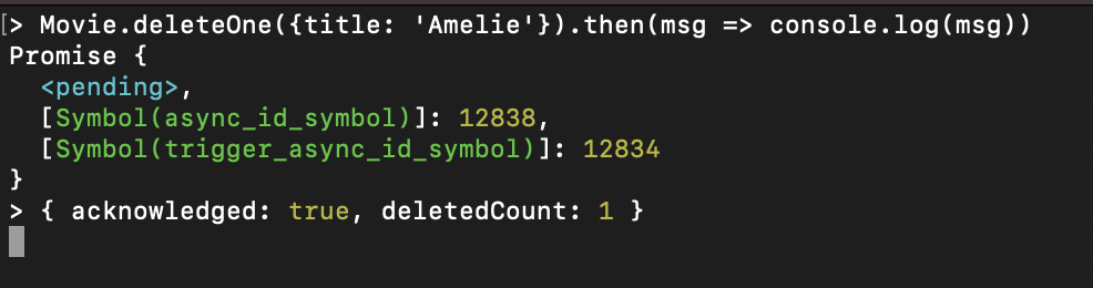Movie.deleteOne({title: 'Amelie'}).then(msg => console.log(msg))