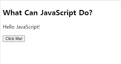 위의 코드에서 보았듯이 <p>태그의 id가 demo인걸 알수있고 버튼을 클릭하면 onclick='document.getElementById("demo").innerHTML = "Hello JavaScript!"' 이부분에 의해서 p태그 안의 내용이 바뀌는걸 알수 있다.