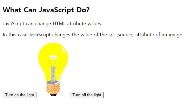 <button onclick="document.getElementById('myImage').src='pic_bulbon.gif'">Turn on the light</button>